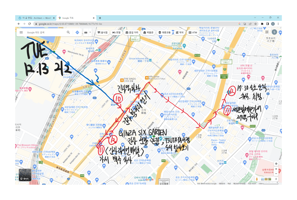 긴자 6의 전망대, ginza 6 garden에는 사람도 거의 없다시피 했고, 풍경은 선명한 도쿄타워 못지 않은 긴자 주변의 마천루들이 나의 눈을 즐겁게 했다. 적당한 차량들의 밀도로 찬 도로들, 쉴새없이 제 갈 길을 가는 행인들, 자신을 제일 아름답게 발하는 광고들, 배경이 되어 주는 수많은 빌딩들의 창문에서 나오는 빛들. 저마다 목적을 갖고 있었다. 발바닥도 나에게 목적을 알려 주었다. 너무 걸어서인지 발바닥이 아파서, 오늘 일정은 이걸로 마치고, 이른 저녁 숙소로 복귀하기로 결정했다. 원래였으면 오모테산도 거리에서 일루미네이션을 보는 거였지만, 나중에 가 보기로 하고 숙소로 향했다.