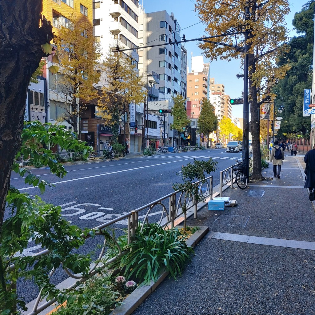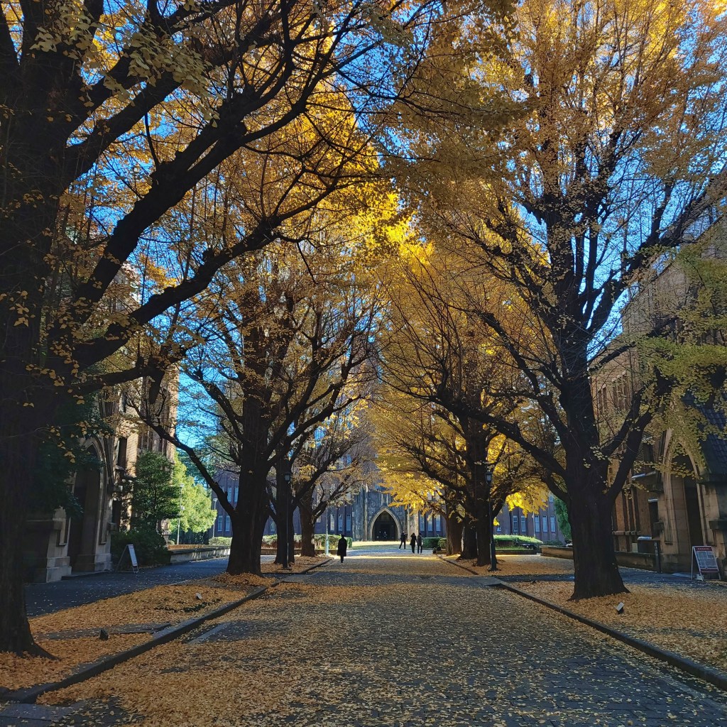 지하철도 이제는 점차 익숙해져서, 출근길의 시민들을 찬찬히 관찰도 해보기도 하면서 여유롭게 혼고산초메역에 하차를 했다. 혼고산초메 역 주변에는 도쿄 대학이 있다. 그렇다. 나는 도쿄 대학에 한 번 가보고 싶었다. 이유는 매우 단순한데, 극단적(?) 학벌주의라고 자랑할 만한 고등학교 3학년의 나는 명문 대학교들을 알아보다가 어쩌다 도쿄 대학도 알아보게 되었는데, 그 은행잎 두 장이 교차된 듯한 로고가 상당히 이쁘고, 교정 사진을 보니 나중에 일본 여행을 한다면 한 번은 가봐야지 싶어서 그렇게 이번 여행 계획에 넣은 것이다. 그리고 캠퍼스 같은 건물은 건축 상 특정 도시의 상징이 될 법도 한 주요 시설이기도 하고, 그 즉슨 시민들에게도 열려 있는, 고등 교육 기관으로서, 권위가 있다는 것이다. 그렇게 도쿄 대학으로 가는 거리 앞 교차로에서 나는 늘어져 있는 은행나무들을 보고 길을 헤매지 않고 목적지로 바로 갈 수 있었다.