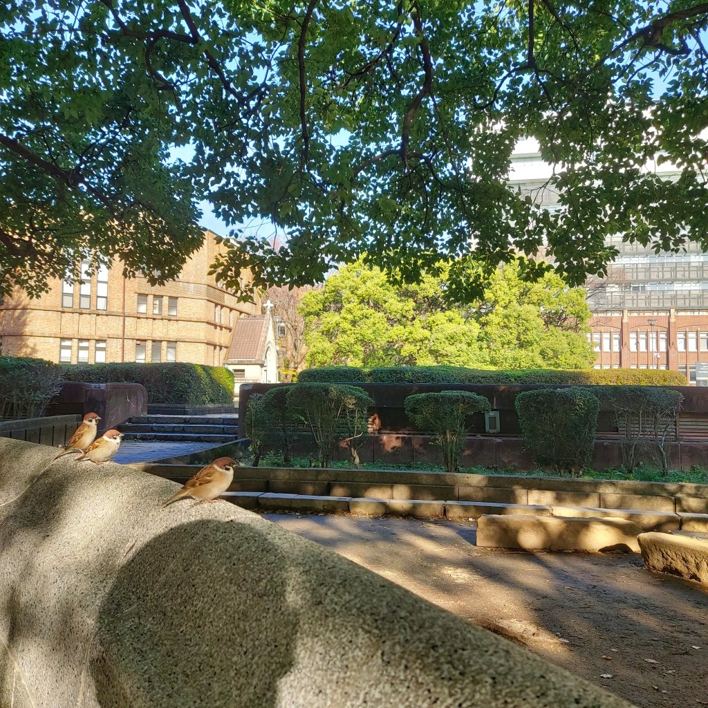 사람도 거의 없었다. 인파는 굳이 말하면 캠퍼스 투어를 온 학생들밖에 안보였다. 정말 조용했고, 은행나무들이 드리우는 그늘은 시원한 바람과 함께 편안함을 주었다. 움직이는 것은 몇몇의 행인, 그리고 나였다. 잠시 여기서 쉬고 갈 겸 벤치에 앉아 교정을 감상하고 있었는데, 워낙 조용하다 보니, 언제부턴가 내 주위에서 같이 앉아 있던 참새들이 보였다.