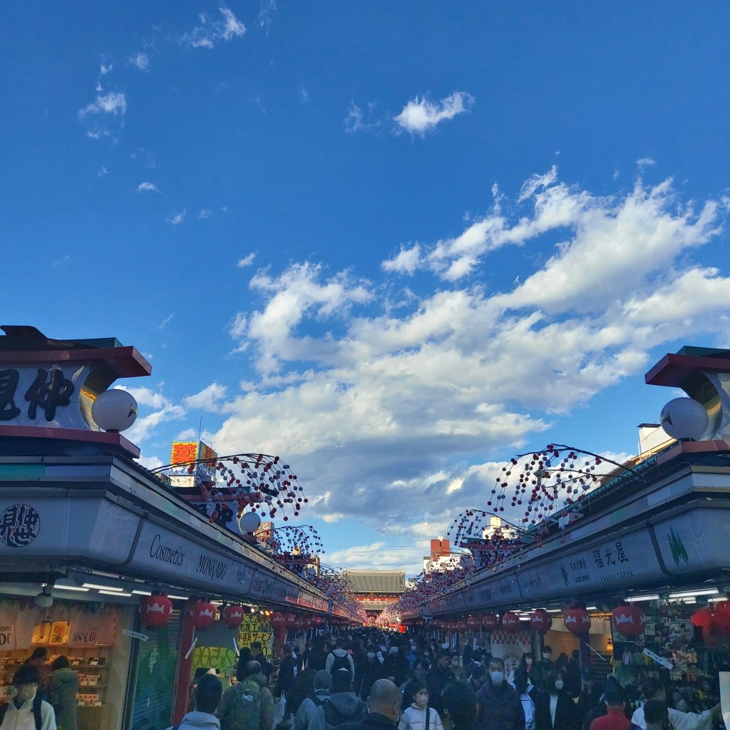 센소지를 바라보는 긴 축 양 옆으로 노점상들이 줄지어 있고, 그 통로로 사람들이 몰린다. 구름은 높고 하늘은 넓다. 전혀 답답하지 않았다. 다양한 외국어가 들리는 이 복도 같은 공간 속에서, 나도 관광객임을 재차 느끼며 즐겼다.