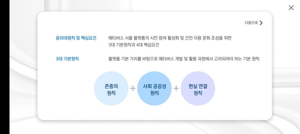 그렇게 행정적 업무에 대한 메타버스적 실험들과 실천 방안을 조사해보니, 서울특별시가 22년 말부터 시행하는 <메타버스 서울>의 ‘메타버스 서울 추진 기본계획(’22~’26)을 알게 되었다. (https://news.seoul.go.kr/gov/archives/539004)