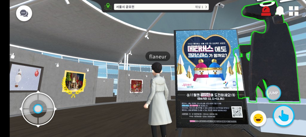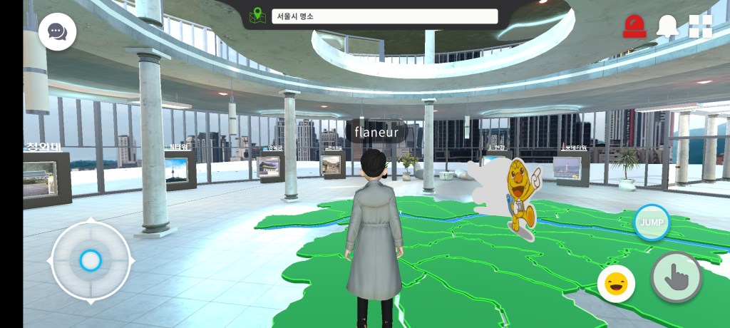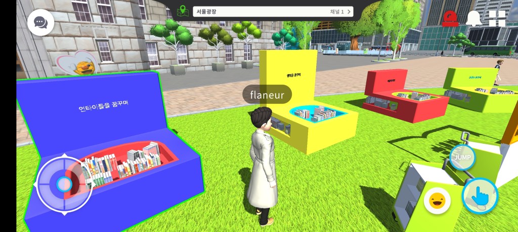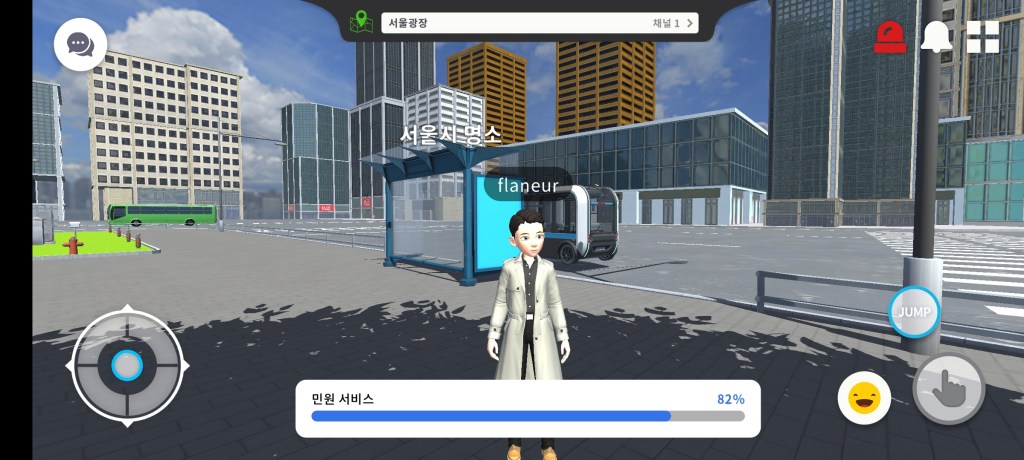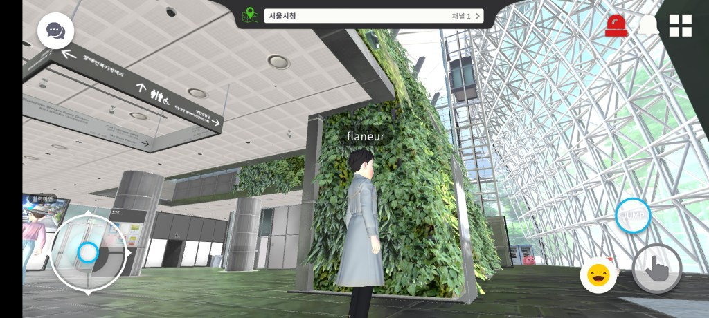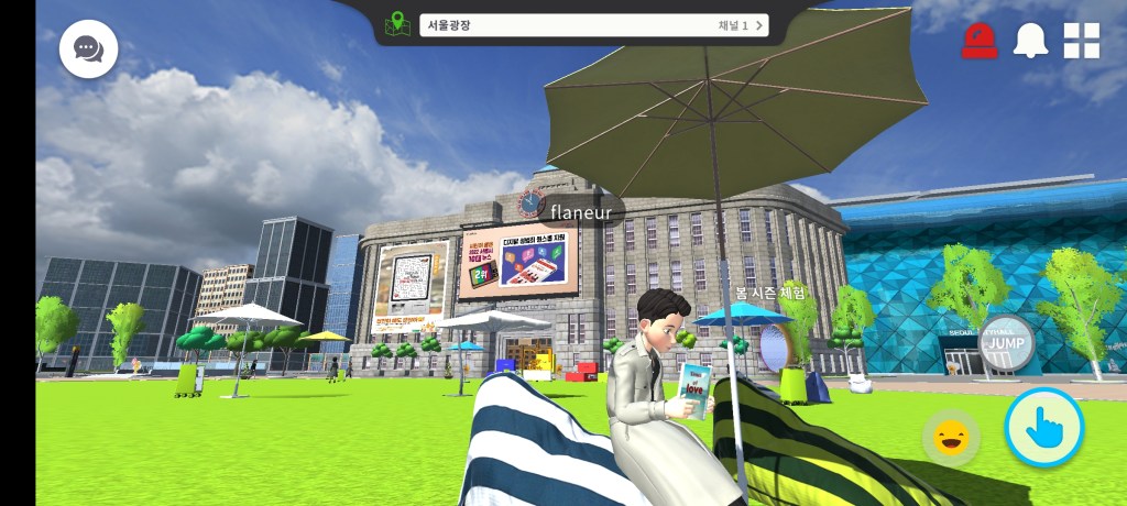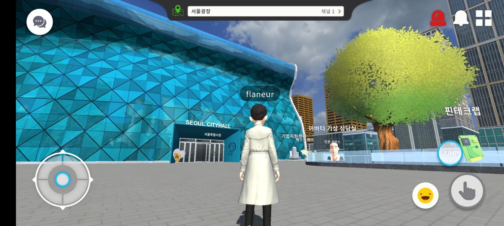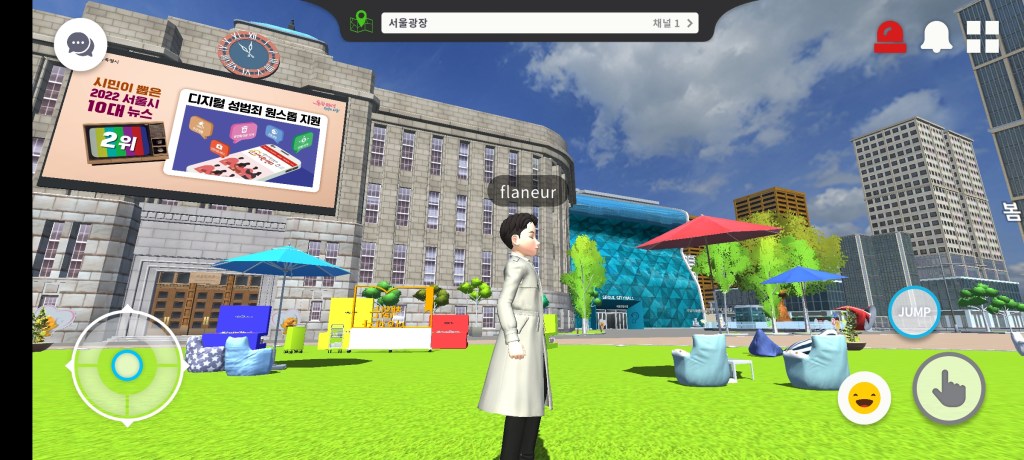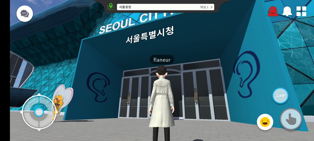 그렇게 메인 장소인 서울광장으로 나와봤다. 메타버스의 재밌는 점은, 실제 공간을 최대한 재현했다는 점에 있다. 직접 그 도시를 거닐거나, 그 장소에 있었던 기억과 비교해가며 제약 없이 거닐 수 있다. 특히 체력도 없고 해서 답사하는 것 마냥 구석구석 더욱 둘러보는 것 같다.