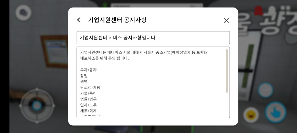 서울시청사 내부도 구현을 잘 해놓았다. 서울시청사 안에는 사진과 같이 공모전도 진행을 했었고, 특히 관심을 끌었던 것은 회의 장소를 생성해 여기서 비대면 스터디가 가능했다. 나중에 활용도 해 보려고 한다. 그리고 시민 참여 회의도 열리면 입장 가능했다. 시장실도 있었다.