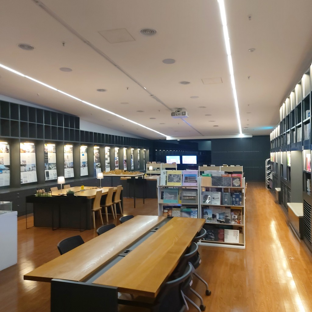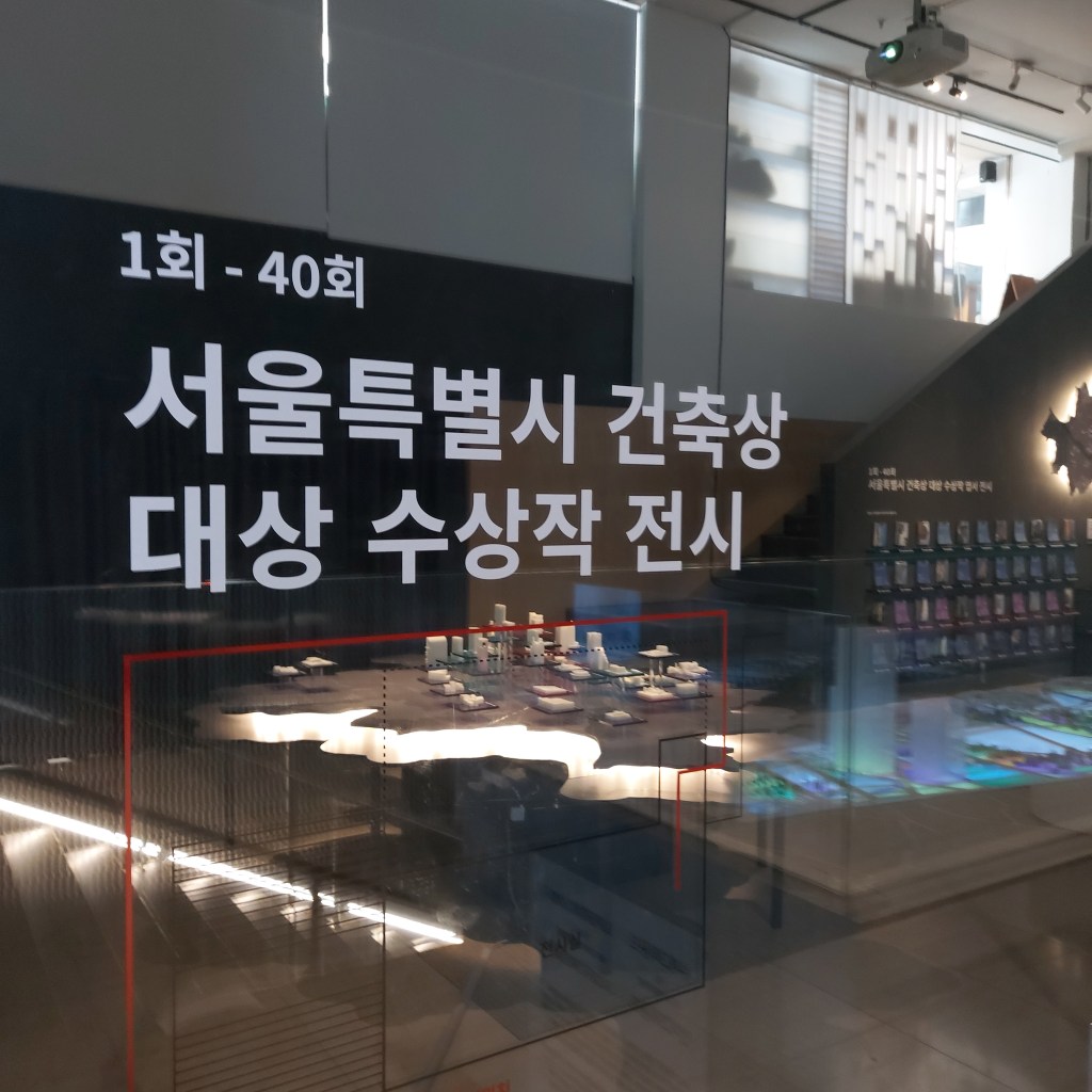 지하 1층 인포메이션 데스크 쪽으로 우측으로 돌아가다보면, 처음에 말했던 지하 2, 3층으로 내려가는 계단과 유리벽으로 분리된 공간 내부로 이어진다. 내가 갔을 때는 서울특별시 건축상 대상 수상작 전시가 이루어지고 있었다. 수상작들 중 관심있게 본 것은 힐튼 호텔, 신길중학교, 어반 하이브 빌딩 등이었다.
